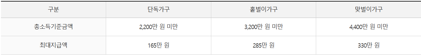 | 2024년 부부합산 연간 총 소득이 가구원 구성에 따라 정한 아래 총소득 기준 금액 미만이어야 함 | |