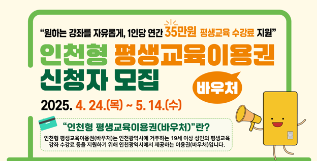 국가 지원 사업이었던 평생교육바우처가 2025년부터 지자체 지원사업으로 개편되었습니다. 따라서 17개의 광역 지자체에서 평생교육바우처 신청을 받고, 선별 과정을 거쳐 지원합니다. 인천시민이 자신의 여건과 교육 수준 등에 맞춰 자율적으로 학습 활동을 할 수 있도록 지원하는 평생교육바우처 신청방법과 사용처를 소개합니다. 빠르게 혜택을 원하시면 아래 버튼에서 확인하세요.