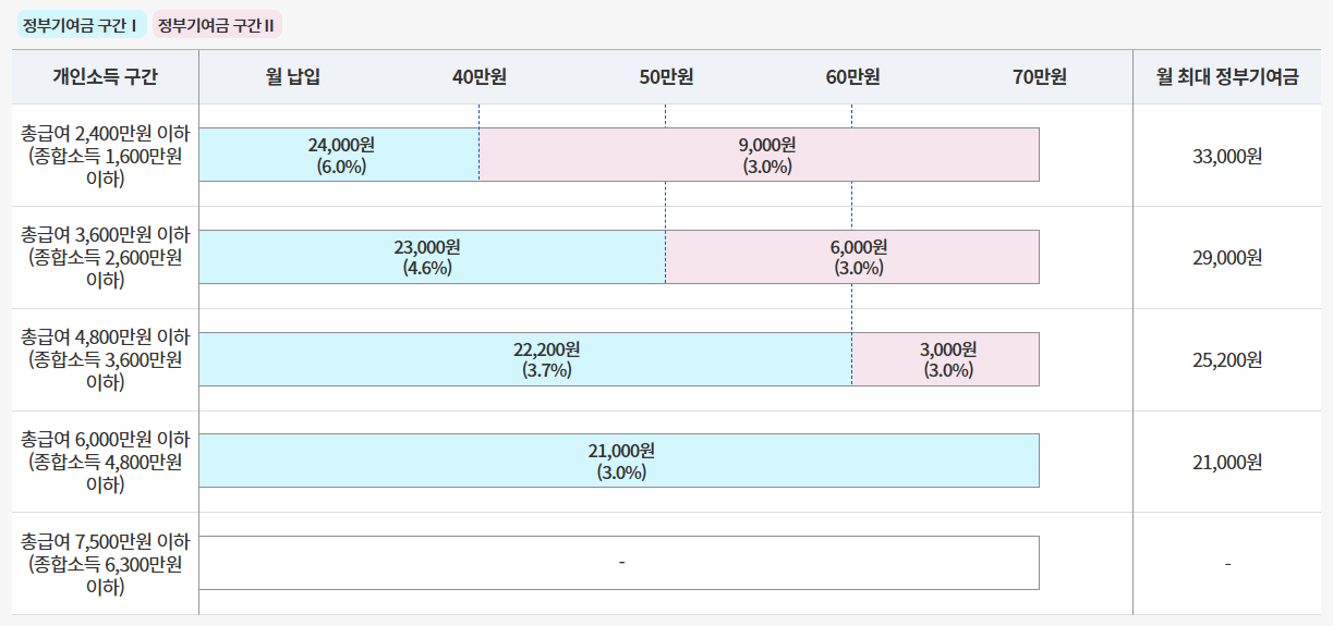 | 정부기여금 | 납입액에 비례해 소득 구간별 정부기여금 지원 |